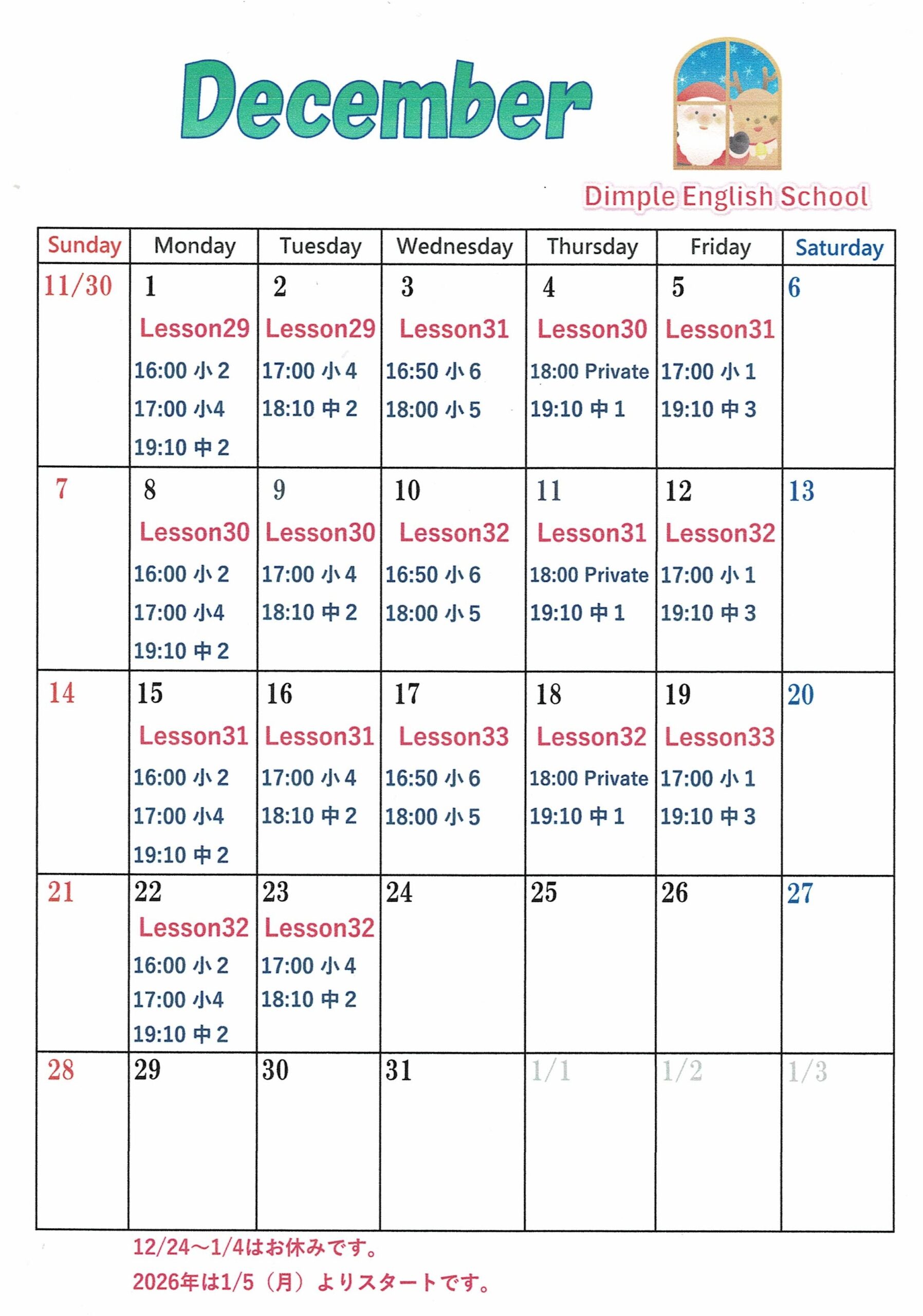 2025年11月6日 / 最終更新日時 : 2025年11月6日 dimple Dimple Diary School Schedule 2025 December 12月のスケジュールをご連絡します。 毎年12月にオンラインレッスンを開催していましたが、 この時期は体調をくずされる生徒さんもみえますので オンライン発表会は年度終わりに開催する予定です。 よろしくお願いいたします。 12/24~1/4はお休みです。 2026年は1/5(月)よりスタートします。 Follow me! FacebooktwitterHatenaPocket コメントを残す コメントをキャンセルメールアドレスが公開されることはありません。 ※ が付いている欄は必須項目ですコメント ※ 名前 ※ メール ※ サイト 次回のコメントで使用するためブラウザーに自分の名前、メールアドレス、サイトを保存する。 Δ